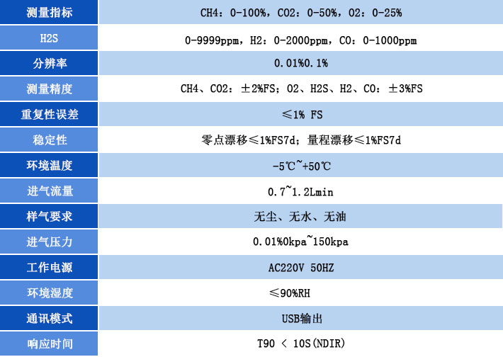1、一臺儀器同(tong)時測量沼氣中CH4、CO2、H2S、O2、H2、CO的體積濃(nong)度